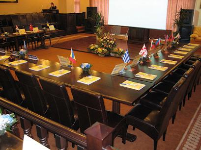 2 sali de conferinta cu capacitatea de 80 locuri respectiv 240 de locuri, dotate cu: mobilier elegant, functional, aer conditionat, video si retroproiector, instalatie de sonorizare, microfoane fixe si mobile, ecran cu actionare automata, flipchart, indicator cu laser, TV, acces direct la internet, fax copiator, terasa.