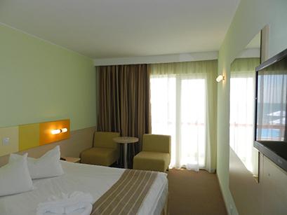 Hotelul dispune de 290 spatii de cazare, majoritatea cu vedere la mare, luminoase si confortabile, modern mobilate si decorate dupa cele mai inalte standarde de calitate. Structura camerelor este alcatuita astfel incat sa ofere turistilor un grad sporit de confort si intimitate: familly room, apartamente, camere duble, single si camere cu paturi suprapuse. Fiecare camera este dotata cu: aer conditionat, minibar, tv-cablu, conexiune internet wirless, casa de valori, acces pe baza de cartela magnetica, uscator de par.
